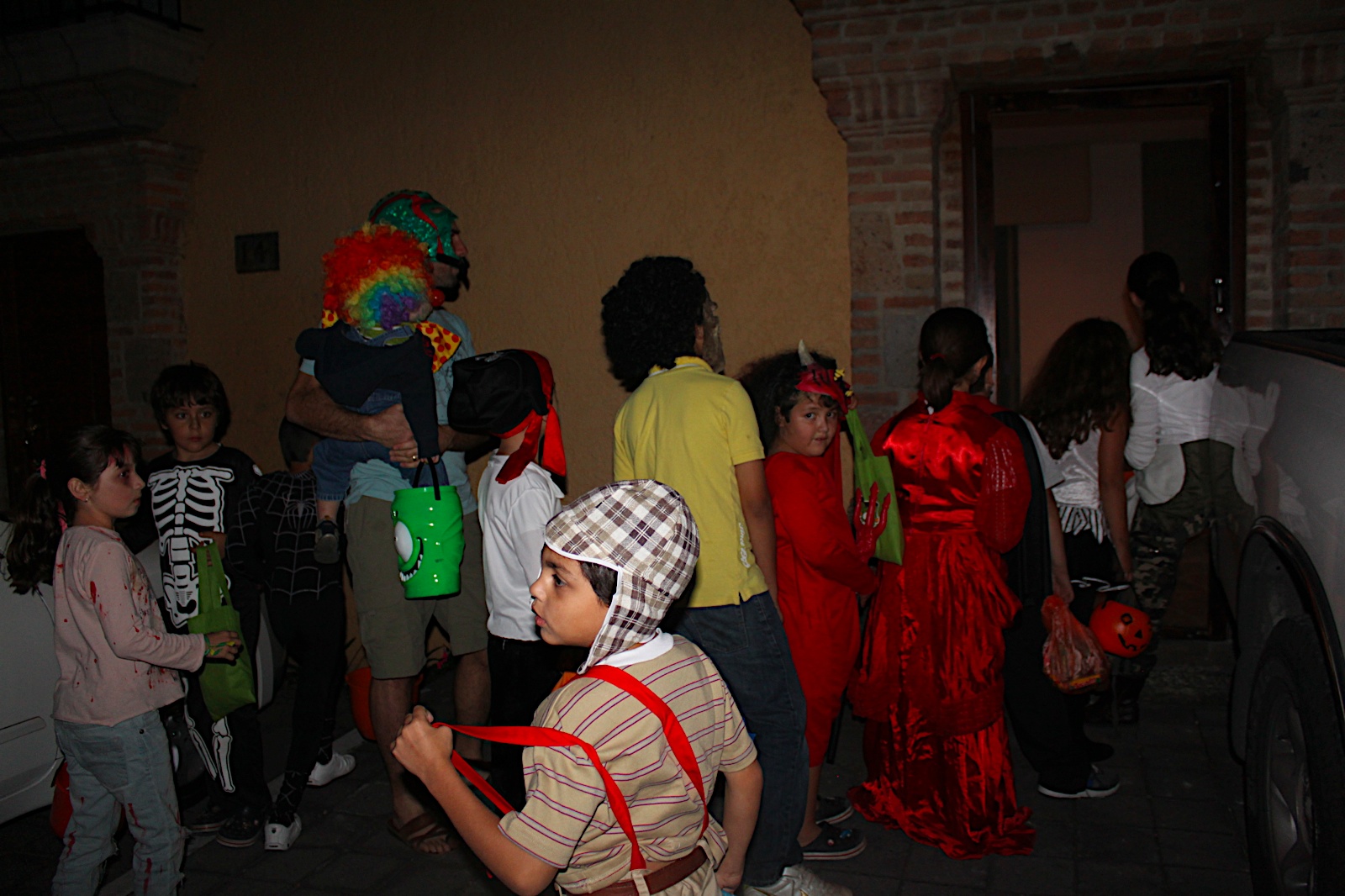 All the kids of our coto (gated community) met up to go trick-or-treating together as one group. They went to the first house and yelled: